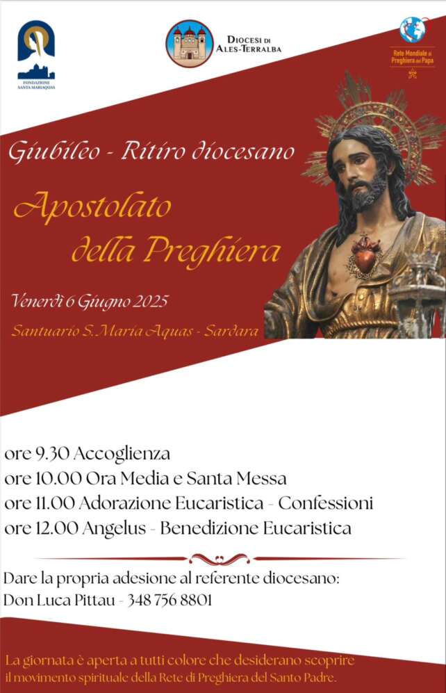 Venerdì 6 Giugno si è svolto, presso la chiesa giubilare di Santa Mariaquas, il Giubileo dell’Apostolato della Preghiera della Diocesi di Ales-Terralba, un appuntamento particolarmente sentito dai fedeli che hanno preso parte con profondo spirito di fede. L’evento, presieduto dal responsabile diocesano don…